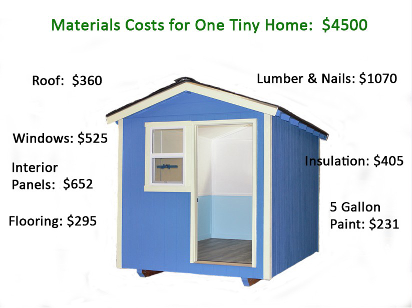 - With our nearly all-volunteer building crew, we still build one tiny home for just the $4500 cost of materials and we’re finishing roughly 3-4 homes per week.