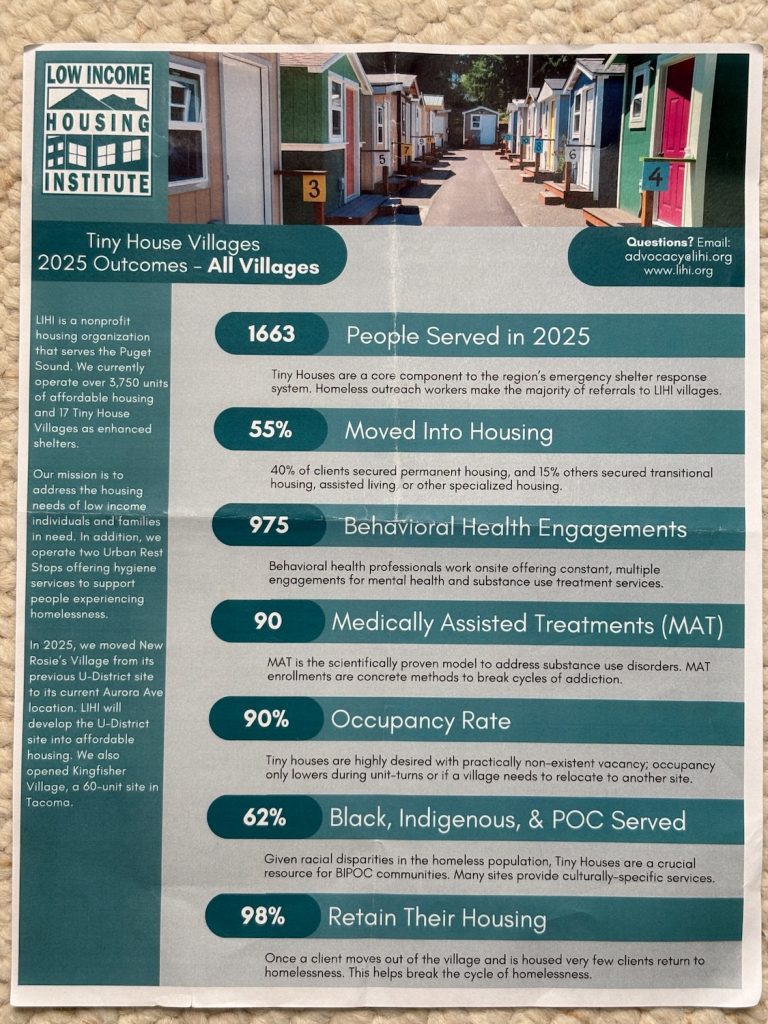 First, most desired: In 2025, LIHI-run tiny home villages had a 90% occupancy rate, and it wasn’t higher due mostly to unoccupied nights as residents moved out and in again, or a village was would down to prepare for a move. Regardless, 90% just beats the 86% utilization rate for all emergency shelters system wide in 2025, as measured by the KCRHA.