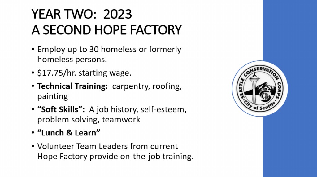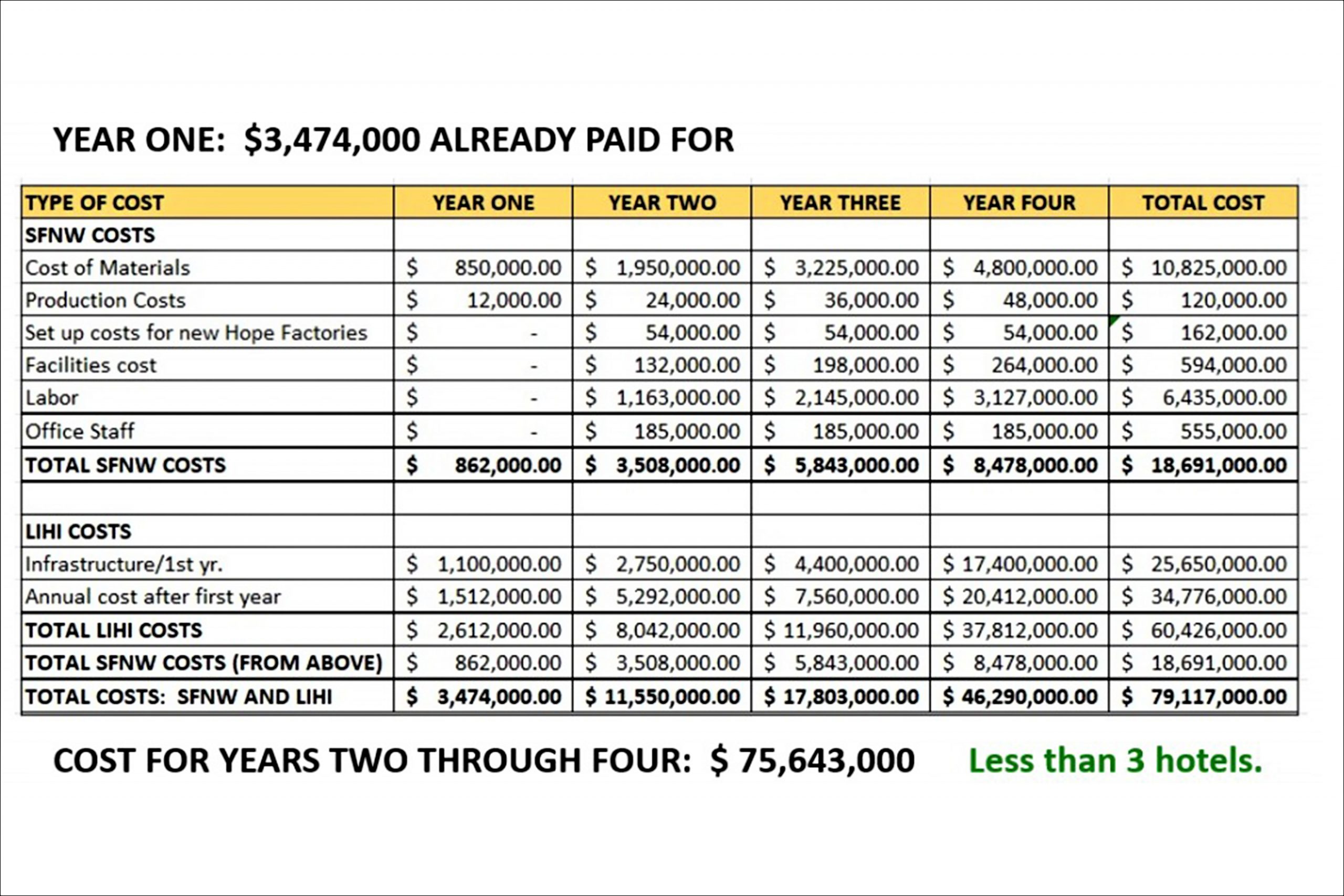 - Facilities cost for The Hope Factory: current year: donated by LIHI. Additional years: $66K/yr. per facility.